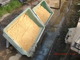 一晩水に浸けた籾の水切り・・・・乾燥させます