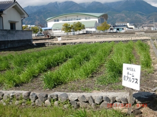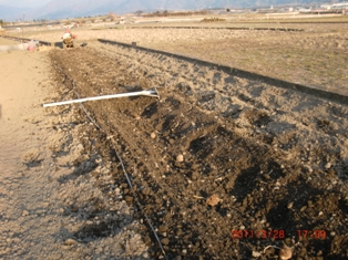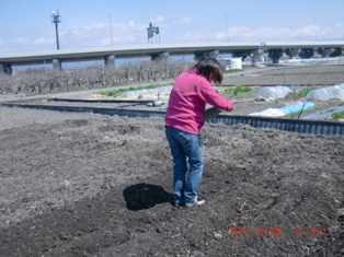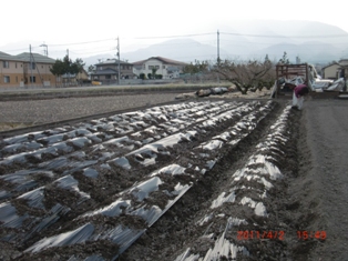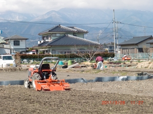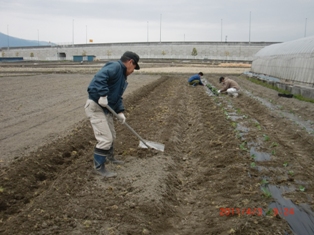 保科さん柴田君農業協力隊の坂田君それに若者で土入れ