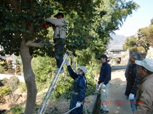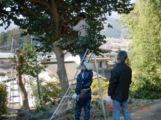 脚立の上でチェーンソー作業は、結構大変です 斉藤先輩の指導で椿の木も