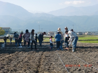 70㌢間隔で棒で線を引き(溝付け)種を蒔きました